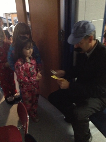 After watching the movie The Polar Express, each child received a ticket. Later we heard the train whistle and the conductor calling "All aboard!" When we opened our classroom door, there was the Polar Express. After having our tickets punched, we sat on the train while the conductor read the story to us. When we came back in our room, each child had a bell waiting at his/her table. You can only hear the bell if you believe!